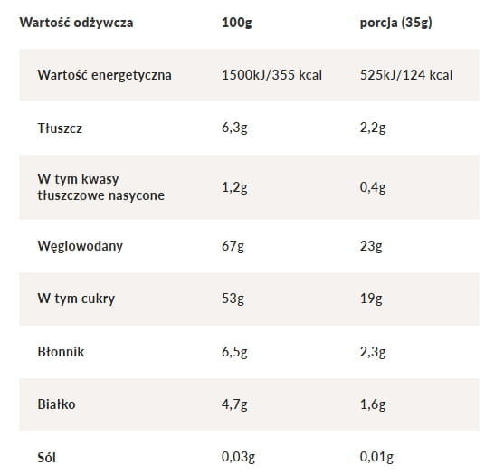 Składniki: daktyle suszone (62 %), jabłka suszone (15 %) (zawierają siarczyny), orzechy nerkowca (11 %), rodzynki, chrupki zbożowe (mąka kukurydziana, mąka ryżowa), cynamon (0,8 %).