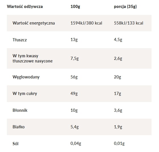Składniki: daktyle suszone (72 %), wiórki kokosowe (14 %), orzechy nerkowca (6 %), orzeszki ziemne prażone (5 %), chrupki zbożowe (mąka kukurydziana, mąka ryżowa).