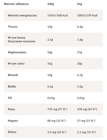 Może zawierać inne orzechy, orzeszki ziemne, nasiona sezamu, zboża zawierające gluten. Produkt może zawierać pestki owoców lub ich fragmenty. Bez dodatku cukrów. Zawiera naturalnie występujące cukry. Opakowanie zawiera 1 porcję.