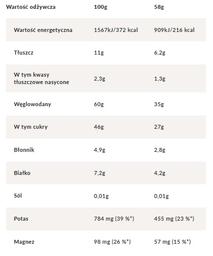 Może zawierać inne orzechy, orzeszki ziemne, nasiona sezamu, zboża zawierające gluten. Produkt może zawierać pestki owoców lub ich fragmenty. Bez dodatku cukrów. Zawiera naturalnie występujące cukry. Opakowanie zawiera 1 porcję.