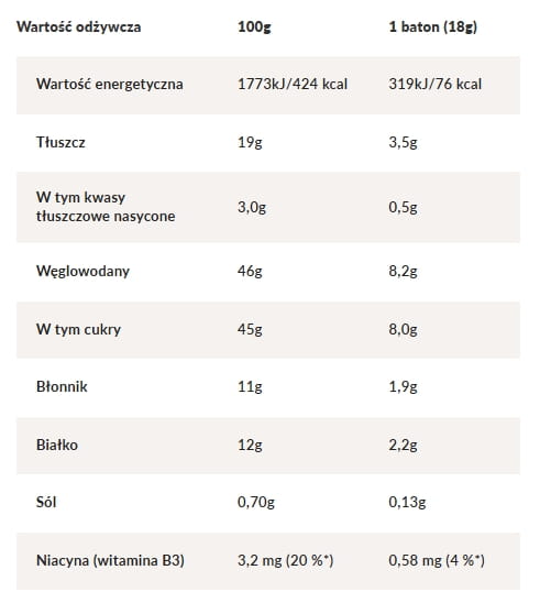 Może zawierać mleko, nasiona sezamu, orzechy, zboża zawierające gluten. Może zawierać pestki owoców lub ich fragmenty. Bez dodatku cukrów. Zawiera naturalnie występujące cukry. Opakowanie zawiera 6 batoników.