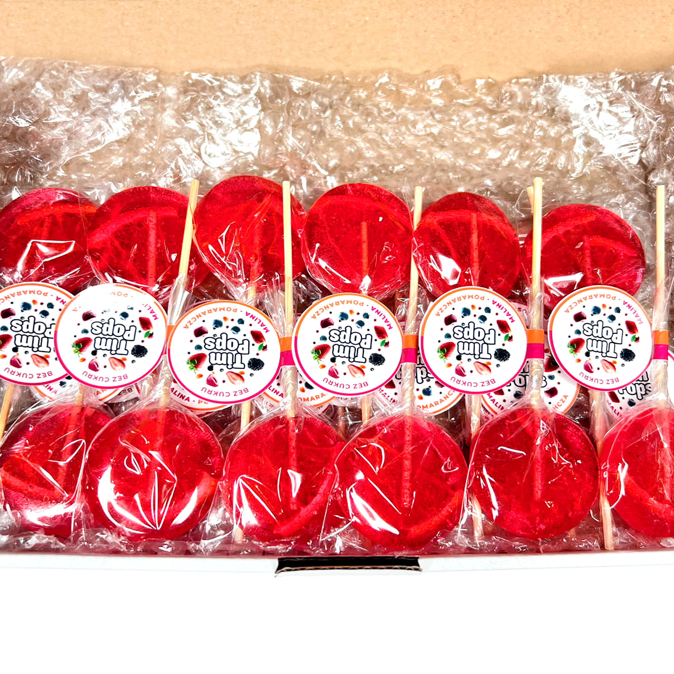 Zestaw zawiera 25 lizaków o smaku malina-pomarańcza!