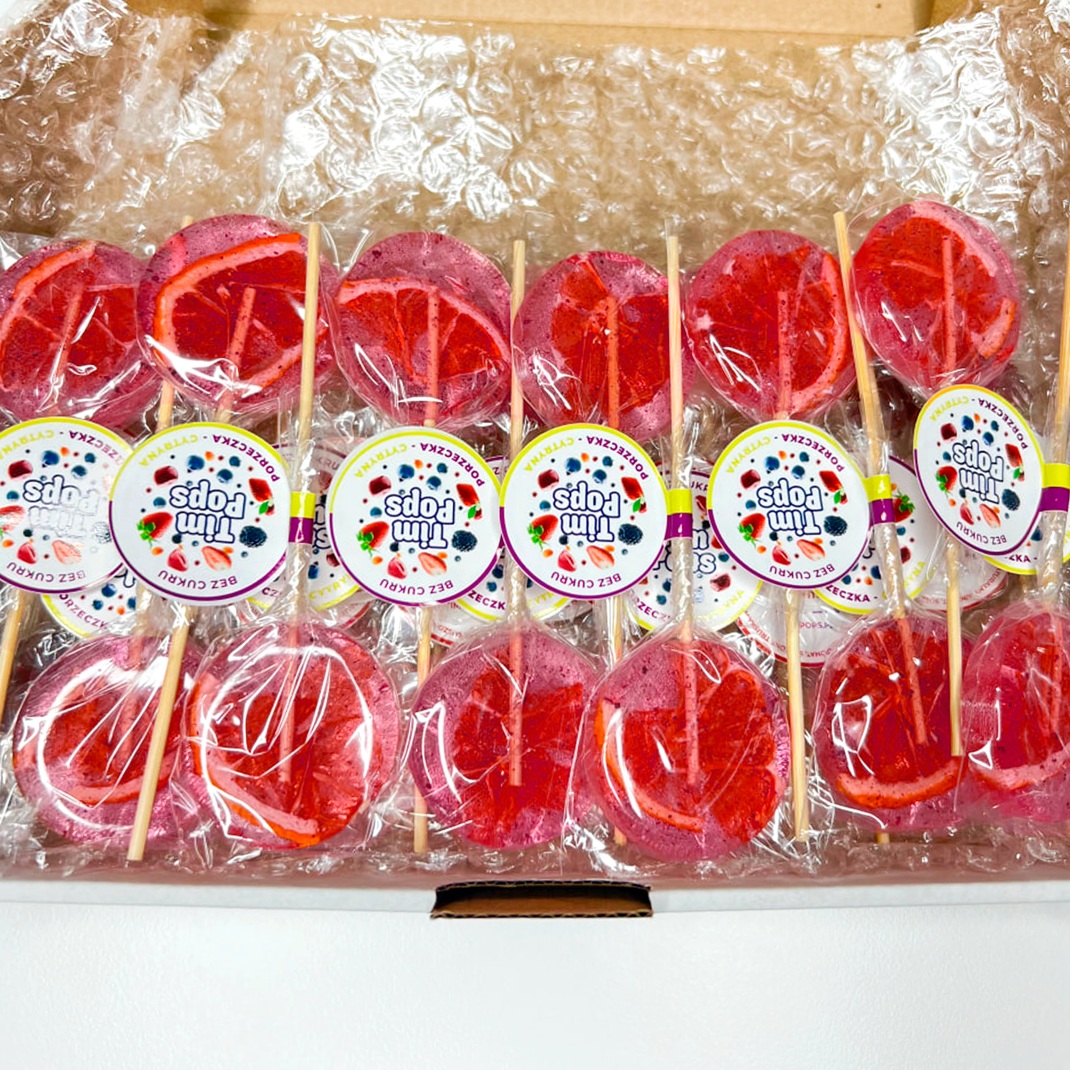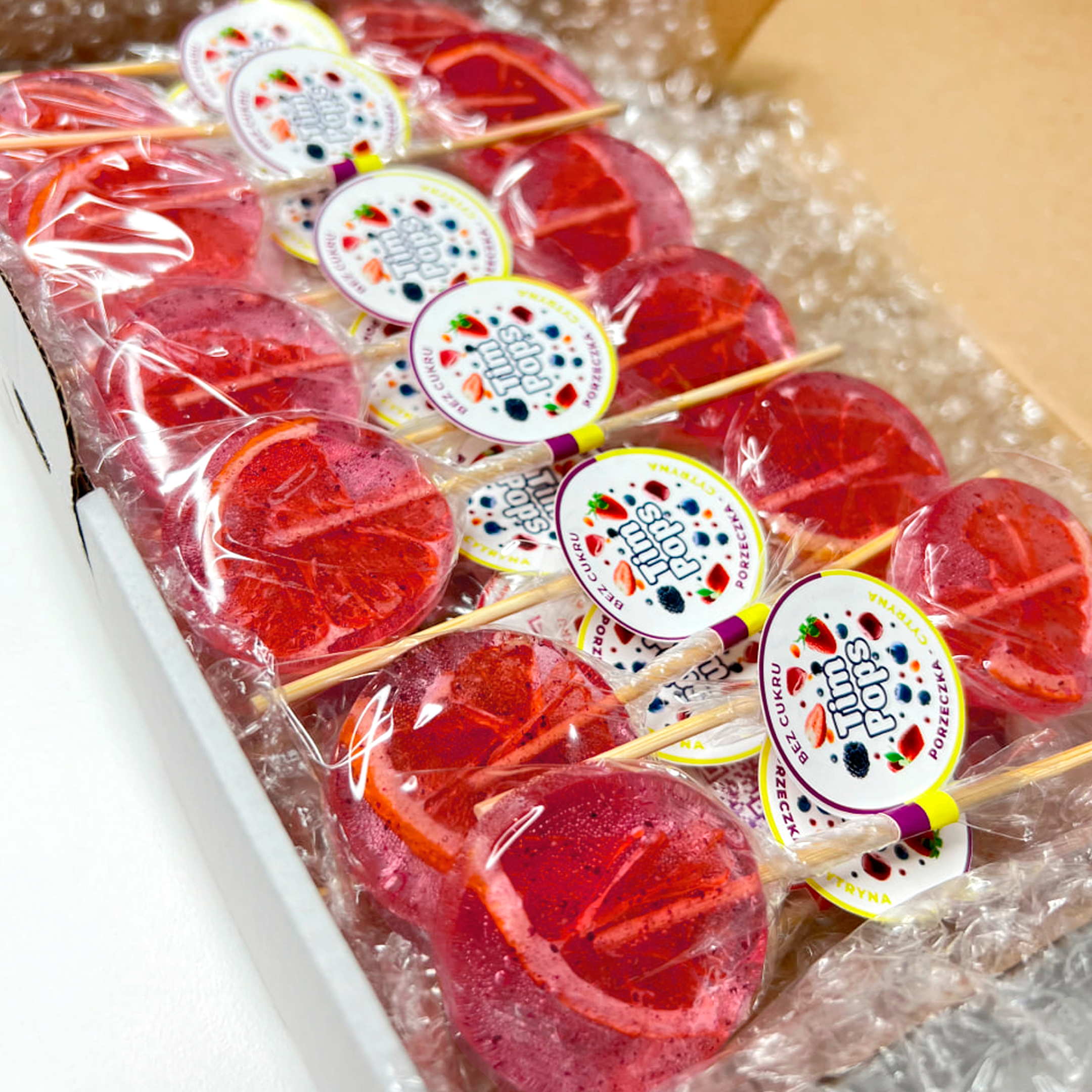 Zestaw zawiera 25 lizaków o smaku porzeczka-cytryna!